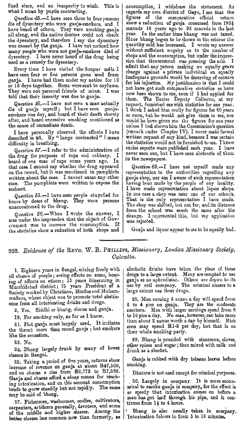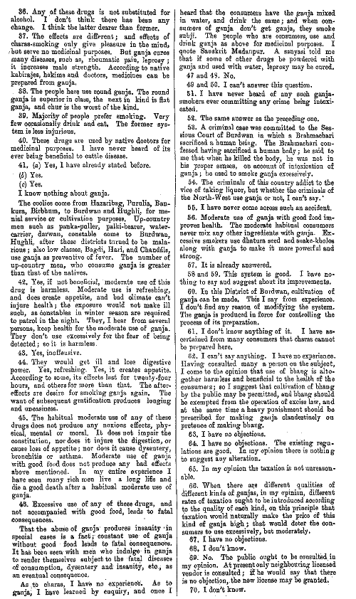 Regarding the statistics of ganja-induced insanity from the lunatic asylums of Bengal, the Commission stated that 'A reference to Chapter XII of this Report will show how untrustworthy these records are in regard to the production of insanity by the use of the drugs—an aspect of the question which is of the utmost importance, and has formed the basis of nearly all the official opinion heretofore recorded against such use. And, after availing themselves fully of every opportunity of consulting the official literature on the subject, the Commission have arrived at the conclusion that it shows little originality, and that a very limited amount of personal observation has been made to do duty as the basis of large conclusions.'