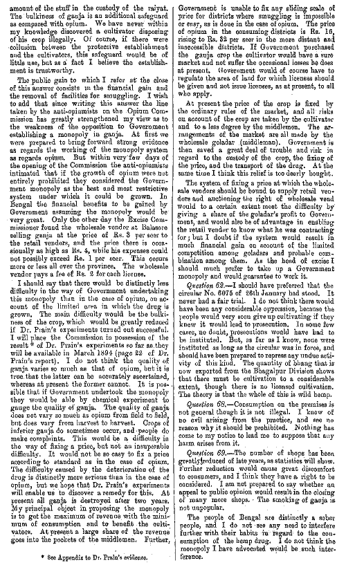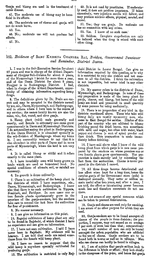 Out of 251 witnesses from Bengal, only a handful - 14 to be precise - were in favour of cannabis prohibition. The Commission reports that 'The Bengal witnesses in favour of prohibition of ganja consist of a Sub Deputy Collector, an Assistant Surgeon, two Medical Practitioners, an Honorary Magistrate, two zamindars, two pleaders, a delegate from the Indian Relief Society, Calcutta, the Secretary to the Band of Hope, Faridpur, the Secretary to the Bogra Medical Society, and two Missionaries.' The arguments that they put forward in favour of ganja prohibition included: ganja cultivation is loss making for the farmer; ganja is an extremely dangerous drug; ganja causes insanity; ganja incites crime; enlightened societies do not consume ganja; ganja is more harmful than alcohol or tobacco which are better substitutes; the ganja using communities are too docile to protest prohibition; etc.