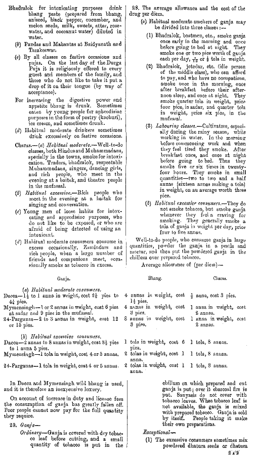 In 19th century India, Bengal was famous for its Rajshahi and Baluchar ganja that was exported and sold to many neighbouring states and even exported to Europe. We see that the elite classes of society consumed ganja but looked down upon it. We see that charas was imported and used almost exclusively by the upper classes. We see from the report that the erroneous definition of cannabis - that the leaves were essentially bhang and the flowers ganja - was put forward by Dr. Prain of the Calcutta Herbarium, and subsequently widely accepted by a large number of people who formed the policy makers regarding cannabis. He said "Ganja consists of the dried flowering tops of cultivated female hemp plants which have become coated with resin in consequence of having been unable to set seeds freely." "Charas is the name applied to the resinous matter which forms the active principle when collected separately." "Siddhi, bhang, subzi, or patti are different names applied to the dry leaves of the hemp plant, whether male or female, and whether cultivated or uncultivated." This definition served to create further confusion, especially given that most people in North India regarded bhang as the beverage from cannabis leaves and flowers crushed together with other ingredients such as spices, nuts, milk, etc., and ganja as the leaves and flowers smoked. This erroneous definition was carried forward to become the basis of the 1961 UN Single Convention Treaty on Narcotic Drugs that stated that the leaves and seeds of the cannabis plant were legal, whereas the flowers and resin were to be considered illegal. When we see that the upper classes and castes of India consumed cannabis mainly as the beverage bhang (which included the flowers and leaves) and the lower classes and castes smoked cannabis as ganja (which also included the same flowers and leaves), the definitions in the drug laws that the leaves are legal while the flowers are illegal, appears to be nothing but an attempt to protect the interests of the upper classes and castes, and to harm the interests of the lower classes and castes.